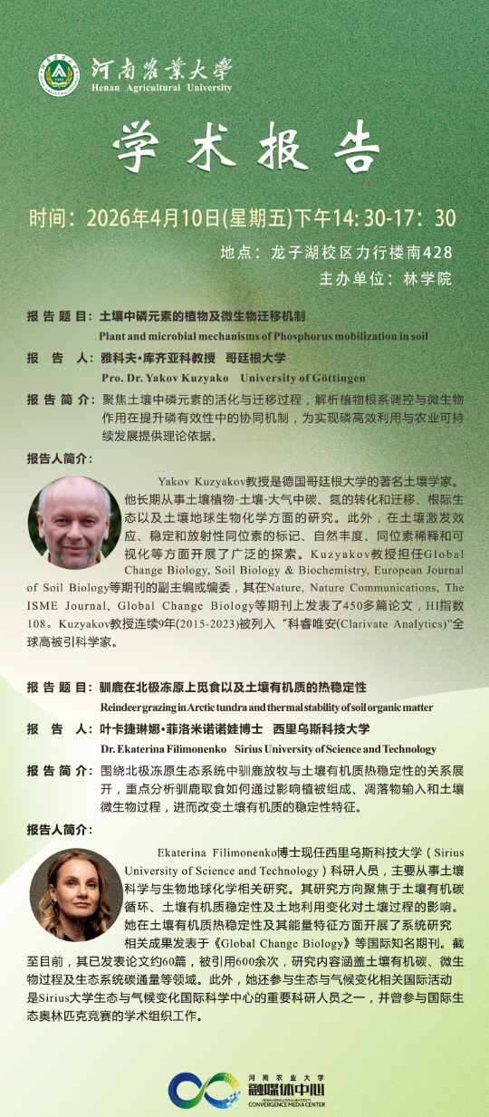报告题目:土壤中磷元素的植物及微生物迁移机制 Plant and microbial mechanisms of Phosphorus mobilization in soil报告人:雅科夫·库齐亚科教授 哥廷根大学 Pro. Dr. Yakov Kuzyako University of Göttingen报告时间:2026年4月10日 14:30-17:30报告地点:力行楼南428会议室报告简介:聚焦土壤中磷元素的活化与迁移过程,解析植物根系调控与微生物作用在提升磷有效性中的协同机制,为实现磷高效利用与农业...