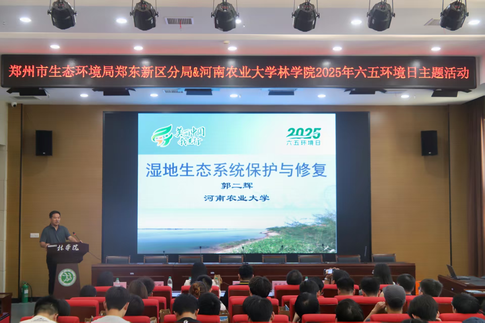 开幕式结束后,学院进行了“六五环境日”的科普讲座。环境系副教授桂新以“减塑护环境,从‘微’做起”为主题,从微塑料的定义与分类、生态环境危害、个人减塑实践路径等三个维度展开系统讲解,展示了生活中常见的微塑料和微塑料危害数据与画面,呼吁同学们从点滴行动守护环境。接着,生态系主任郭二辉就湿地生态系统保护与修复做专业分享,他围绕湿地生态系统的概念、功能、退化机制以及生态修复与重建等四个方面进行知识分享,并结合典型案例与研究数据,引导学生树立科学的生态保护理念,投身湿地生态保护实践。