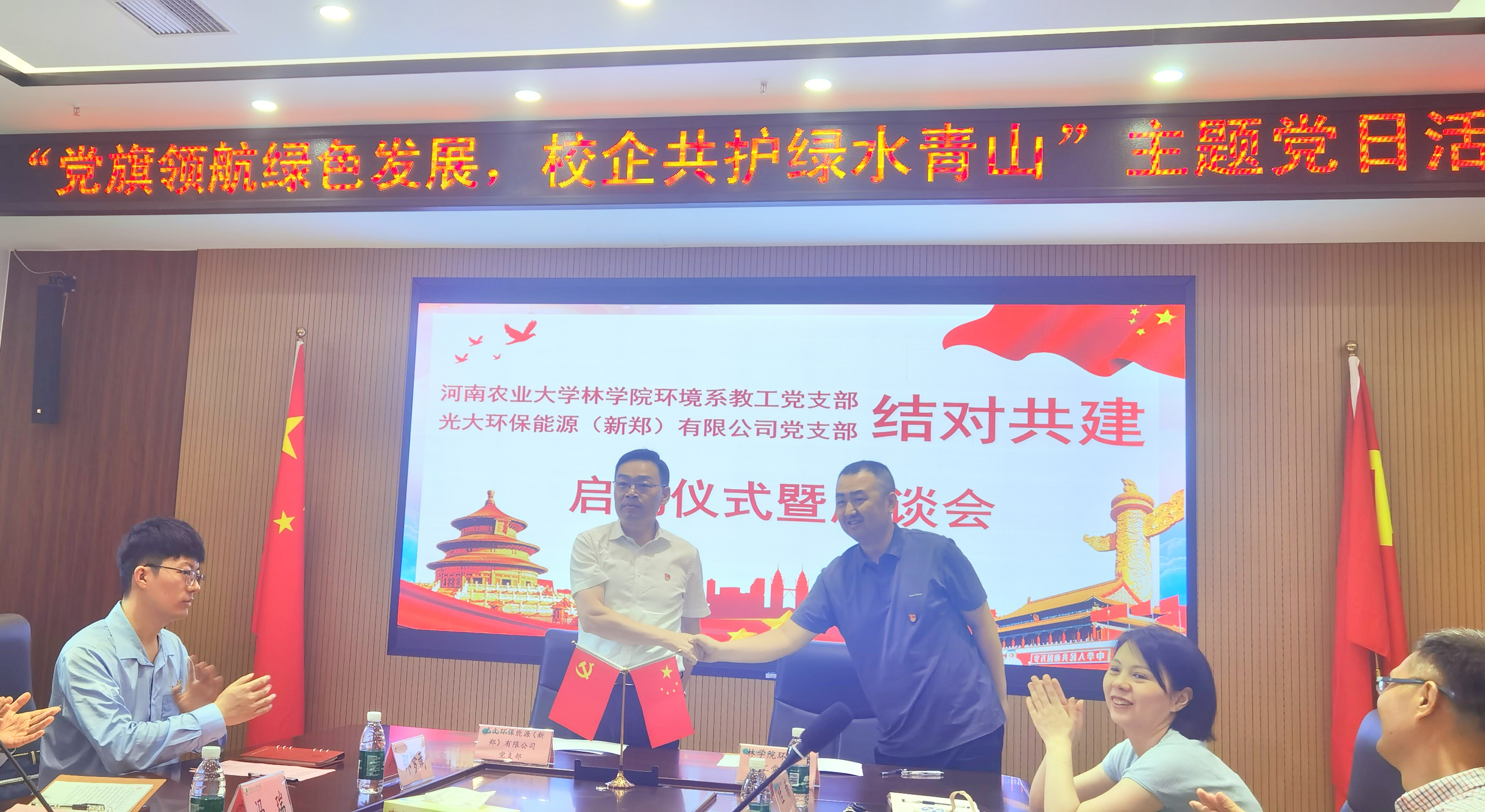 本网讯(通讯员 李利梅)为深入贯彻习近平新时代中国特色社会主义思想,纪念“两山论”提出20周年,6月19日,我院环境系教工党支部与光大环保能源(新郑)有限公司在龙子湖校区力行楼南-231会议室开展“党旗领航绿色发展,校企共护绿水青山”主题党日活动。光大环保能源有限公司的总经理、支部书记周文定,总经理助理、纪检委员杨翠萍等支部成员以及林学院党委书记化青报、党委副书记王娟、环境系教工党支部全体党员参加会议。会议由王娟主持。