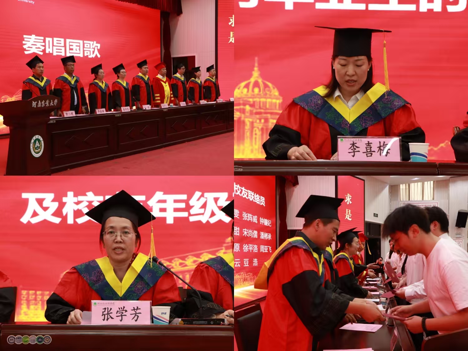 伴随着庄严肃穆的国歌,2025届毕业典礼暨学位授予仪式正式拉开序幕。李喜梅宣读《河南农业大学林学院关于表彰2025届优秀毕业生的决定》,参会领导老师为优秀硕士毕业生代表和优秀本科毕业生代表颁发荣誉证书。张学芳宣读2025届校友联络员名单,领导老师们为校友联络员颁发聘书,希望他们在未来能成为母校与校友之间沟通的桥梁。