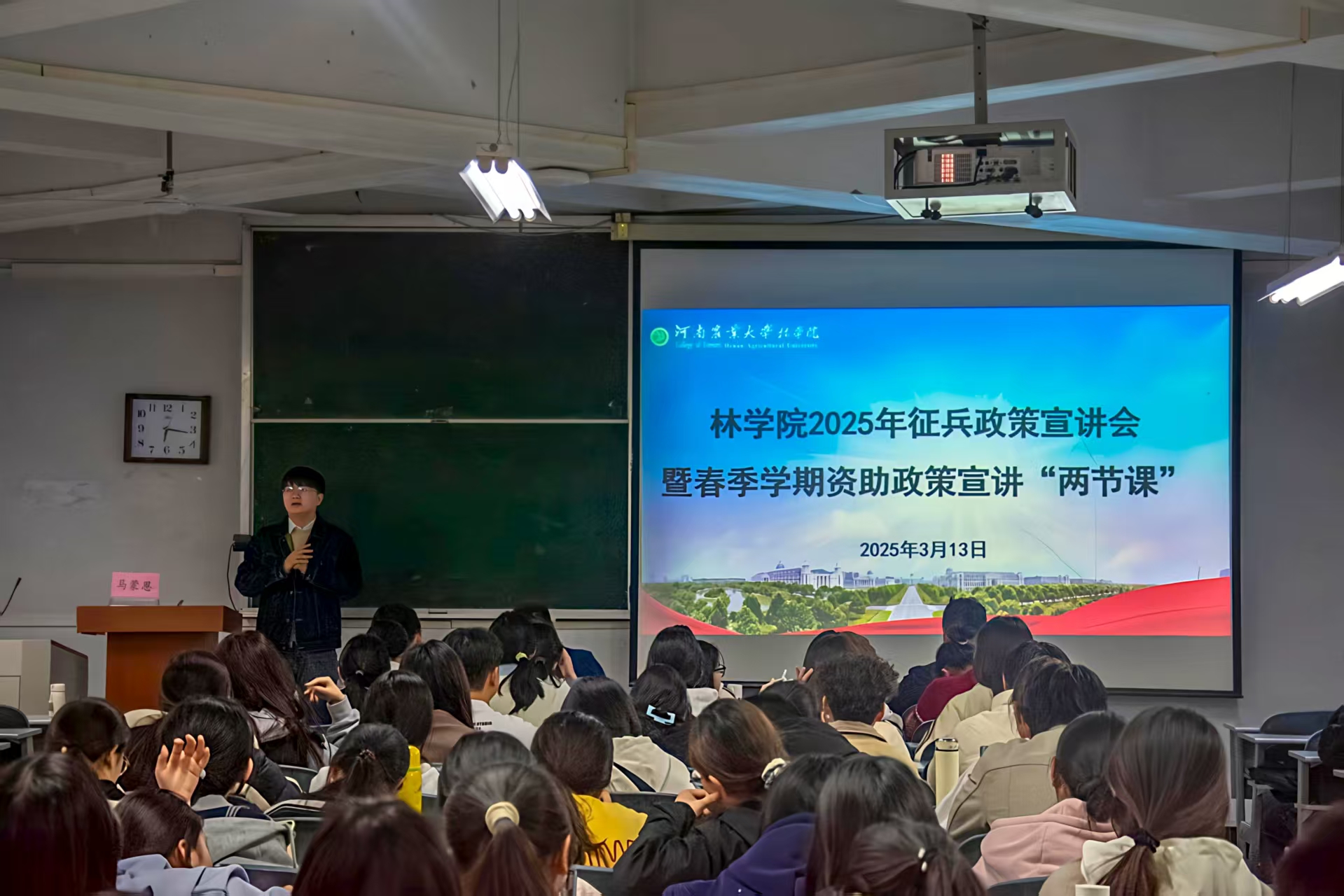 为加强国防安全教育,全面落实国家征兵举措。3月13日下午,我院于桃李园学生公寓桃西楼405教室召开2025年征兵政策宣讲会暨春季学期资助政策“两节课”。本次宣讲会邀请校学生处武装部李传强老师担任主讲,院团委老师马蒙恩、张琛出席讲座、院“携笔从戎”征兵宣讲团成员及24级学生代表参加本次宣讲会。会议由马蒙恩主持。