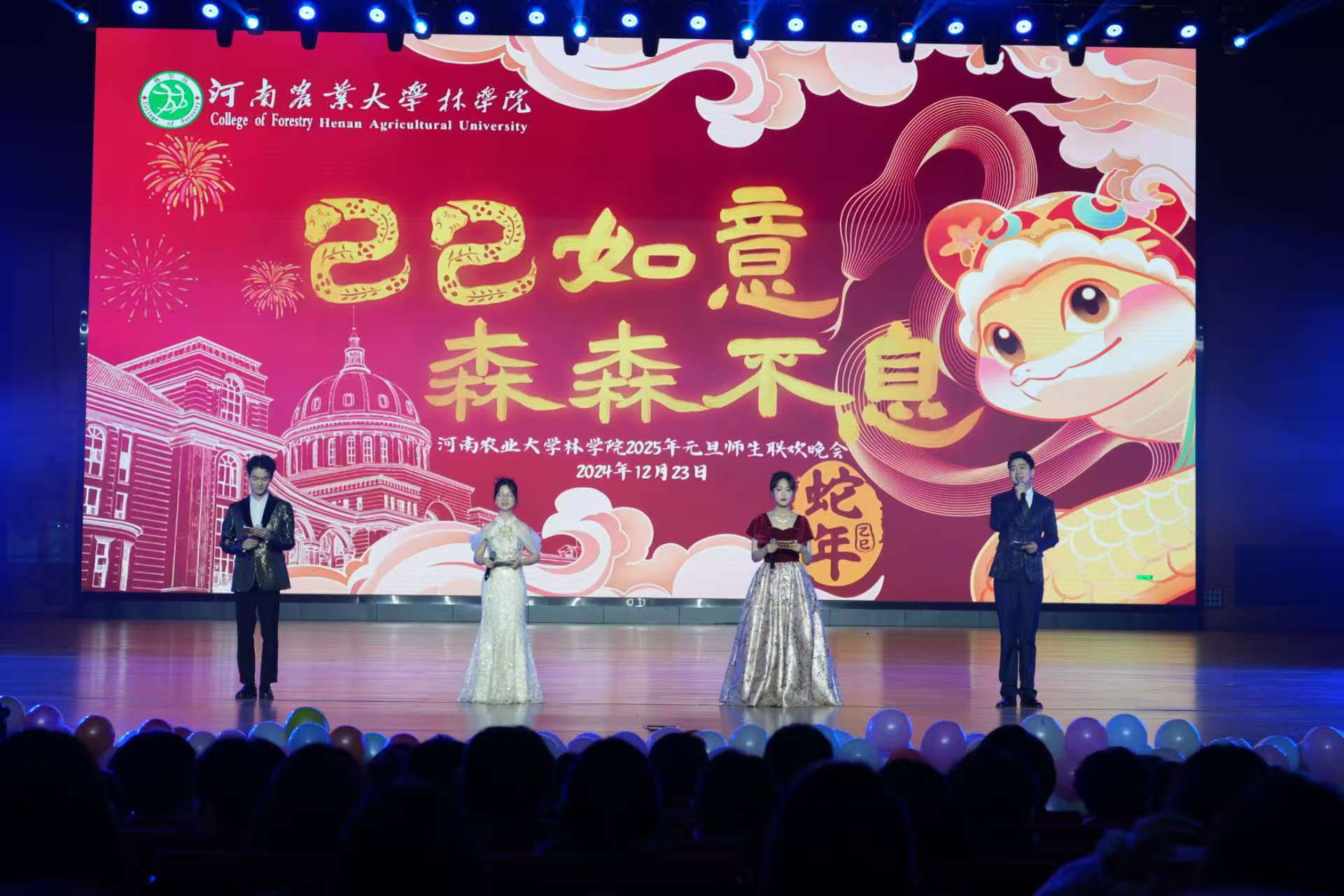 祥龙摆尾辞旧岁,瑞林焕新展宏图。12月23日晚,“巳巳如意,森森不息”林学院2025年元旦师生联欢晚会于龙子湖校区英林讲堂隆重举行。副校长杨喜田、校党委宣传部部长邓振营、校党委学工部部长徐峰、校招生就业办公室主任张红阳、校党委保卫部部长刘全军、校团委书记贾云飞、校工会副主席董晓莉、校党委办公室副主任张保磊、校党委统战部副部长蒋春红、校党委学工部副部长王玲、林学院党委书记化青报等院领导及林学院全体师生欢聚一堂,共同观看了演出。