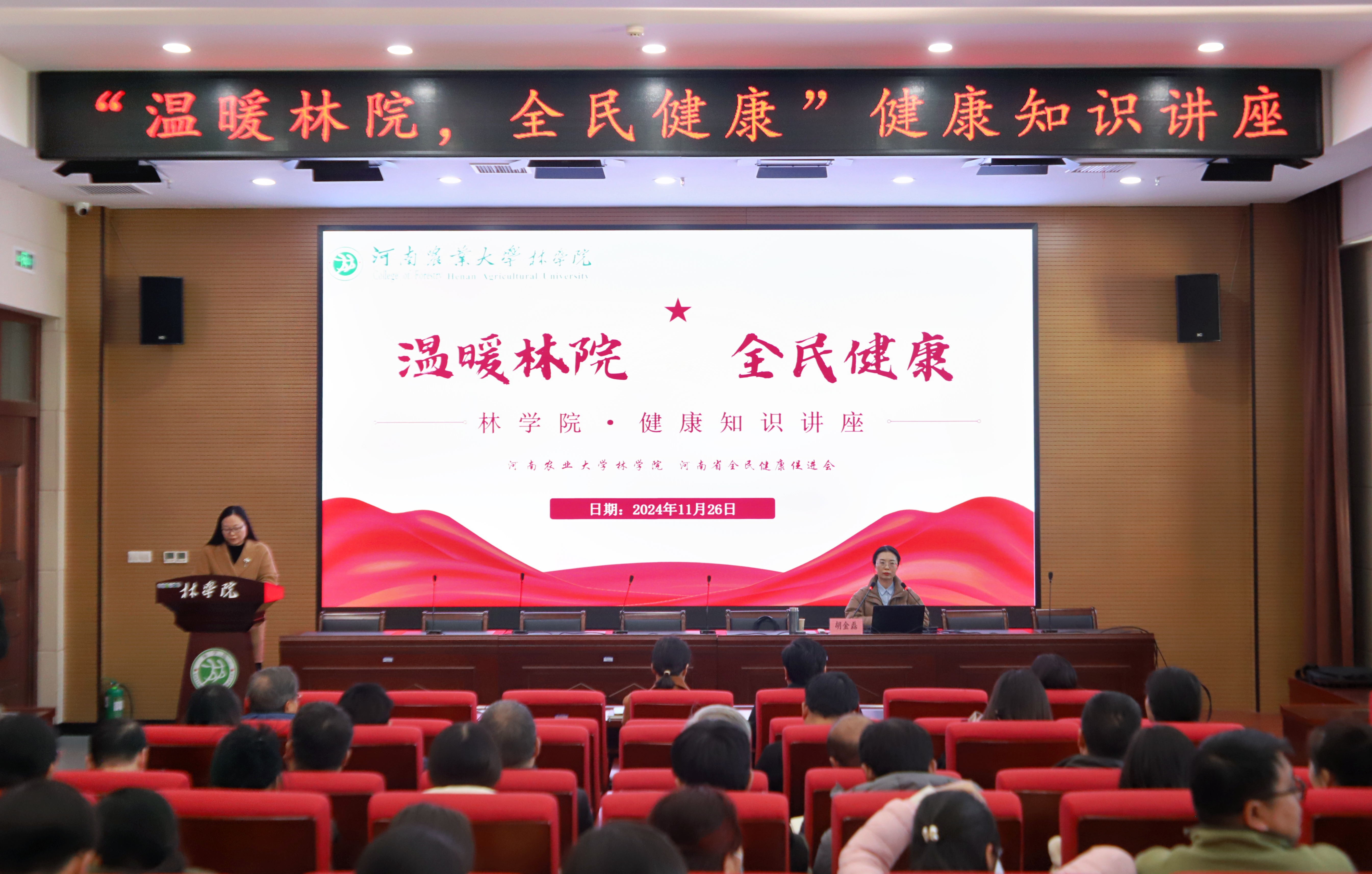 11月26日,我院于力行楼南428报告厅举办“温暖林院,全民健康”健康知识讲座。本次讲座由河南省全民健康促进会健康教育委员会成员、河南省安全健康教育中心宣教办主任胡金磊担任主讲嘉宾。院党委书记化青报、院党委副书记王娟、副院长张学芳、副院长李喜梅出席本次讲座。我院全体教职工及学生代表参加本次讲座。