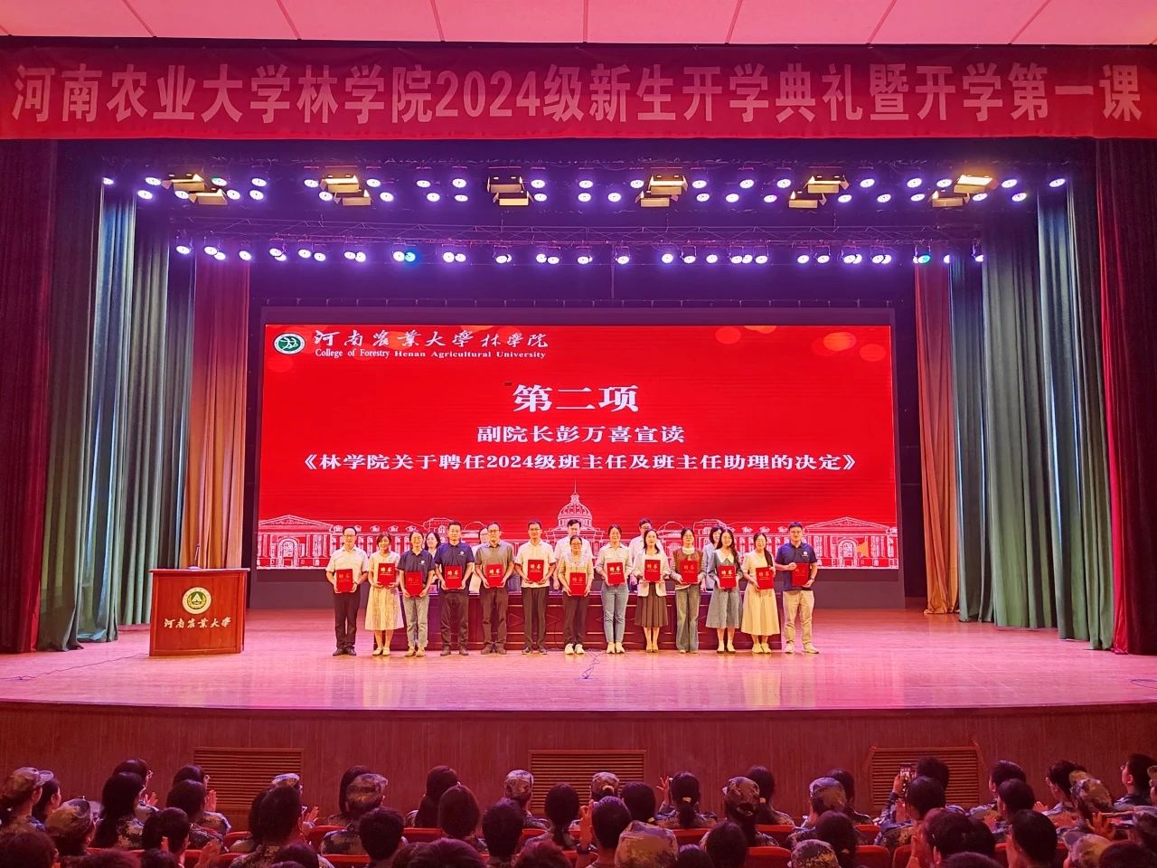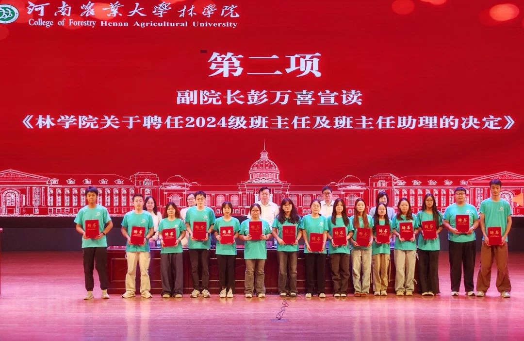 典礼第二项,彭万喜宣读《河南农业大学林学院关于2024级班主任及助理班主任聘任的决定》,与会领导为新生班主任及新生助理班主任颁发聘书。