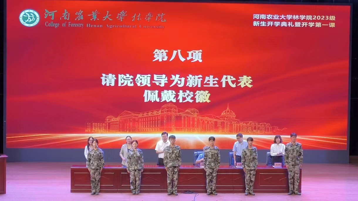副院长彭万喜宣读《河南农业大学林学院关于2023级班主任及助理班主任聘任的决定》,与会领导颁发聘书并为新生代表佩戴校徽。