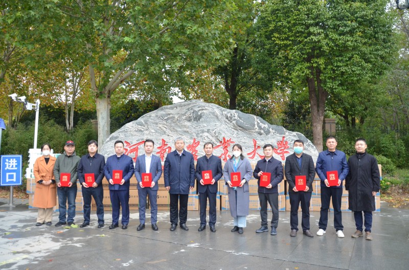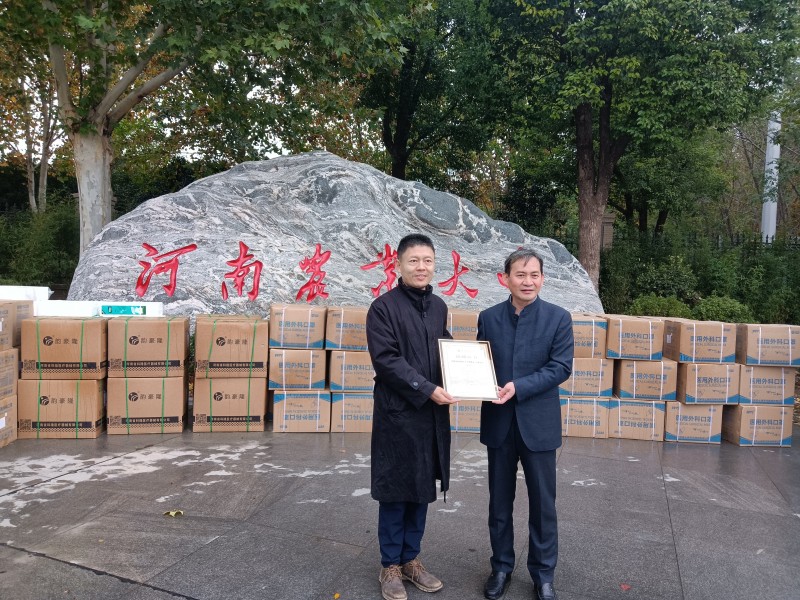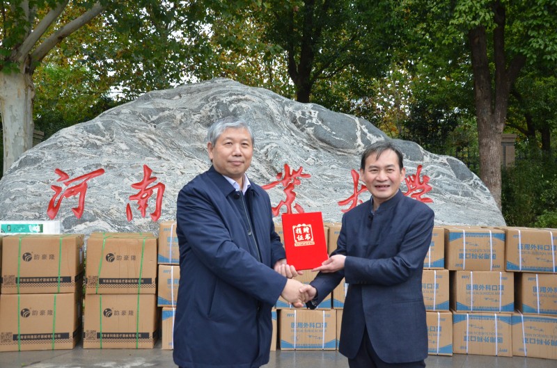 11月12日,民盟河南省委生态文明建设工作委员会主任阴三军一行向林学院捐赠口罩十二万五千个、防护服五百套以及卫生纸二百包等防疫物资。学校校友办副主任闫东、林学院院长范国强、副院长张学芳参加捐赠活动。