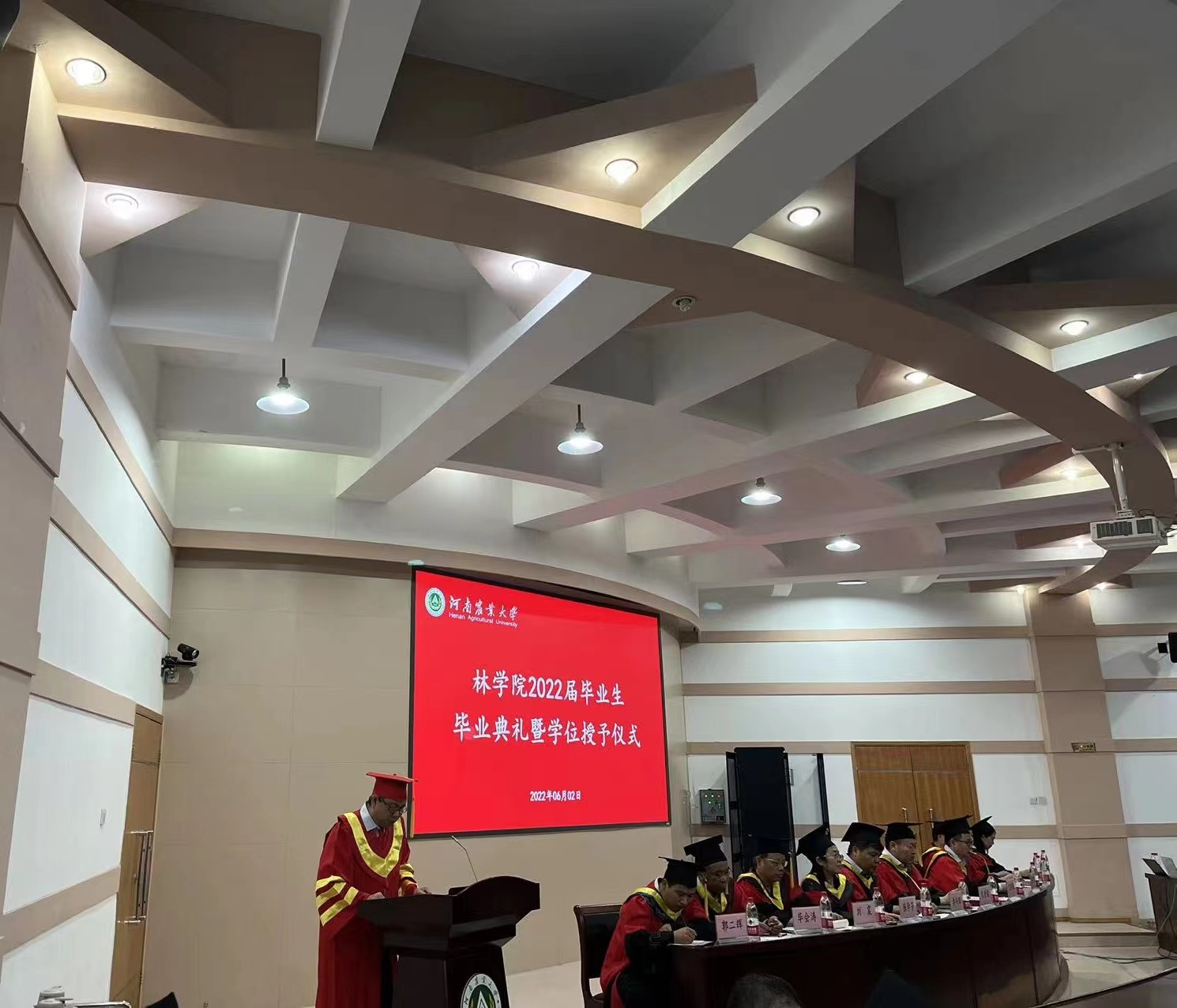 大会开始前,全体毕业生与院领导、院学位委员会委员合影留念。大会在庄严的国旗声中拉开序幕。李喜梅宣读《林学院关于表彰2022届优秀毕业生的决定》,院领导和院学位委员会委员为优秀硕士毕业生代表和优秀本科毕业生代表颁发荣誉证书。张学芳宣读2022届校友联络员名单,院领导为2022届校友联络员颁发聘书。彭万喜宣读《河南农业大学林学院获得学位授予决定》,范国强为博士学位获得者蒋亚君授予学位并颁发学位证书,院领导和院学位委员会委员为硕士、学士学位获得者授予学位并颁发学位证书。