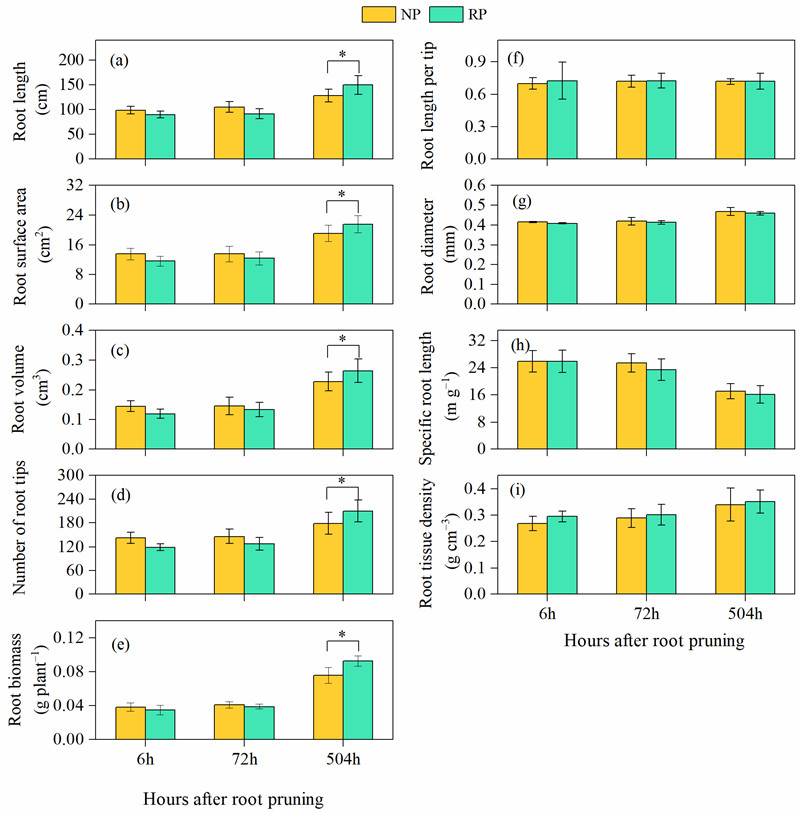 侧柏是我国北方裸露山地植被恢复最常用的造林树种。在人工造林实践中,主要使用侧柏裸根苗进行造林,而其移栽或运输过程中,根系常遭受切根伤害,这制约了苗木造林后的生长和存活,造成森林生态系统严重退化,严重阻碍了我国干旱半干旱地区生态系统恢复和重建。因此,深入理解侧柏根系对切根的响应机制对科学指导植被恢复具有重要意义。在自然界中,植物遭受逆境胁迫或干扰时,根系通常会面临生长与防御间的权衡。然而,侧柏根系如何通过调节生长与防御策略来响应切根伤害的机制,目前尚不清楚。为了全面阐明切根后根系生长-防御权衡的作用机制,该研究利用侧柏为材料,以切根伤害为切入点,综合研究了根系生长、生理和蛋白质的动态特性及其响应规律。