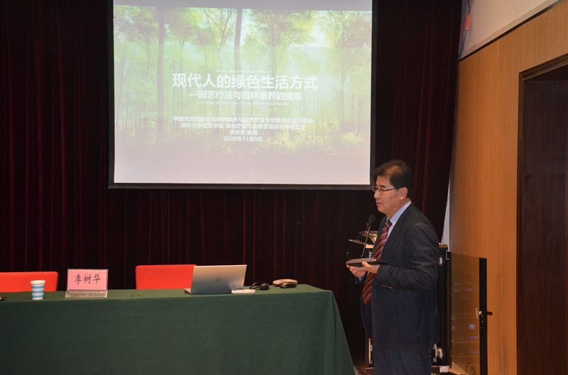 李树华教授分别从“园艺疗法与园林康养的概念”、“城市病与城市人群病”、“园艺疗法与园林康养的功效与机理”、“推进绿色生活方式所面临的挑战”和“我们应肩负的责任”这五个方面阐述了对现代人的绿色生活方式的研究,表明“生态城市+健康城市=绿康城市”。李树华教授还阐述了绿色康养在健康产业和国民经济发展中发挥的重要作用;通过分析日本和欧美国家康养产业的典型案例,深入浅出的带领大家理解绿色康养与国民健康。最后,李树华教授与师生们关于康养专业的发展进行了深入沟通,鼓励同学们发挥自身优势,树立前瞻性的专业思想,激励同学们把学校、专业以及个人的优势有机结合,努力有时代责任感,有明确目标的优秀学子。