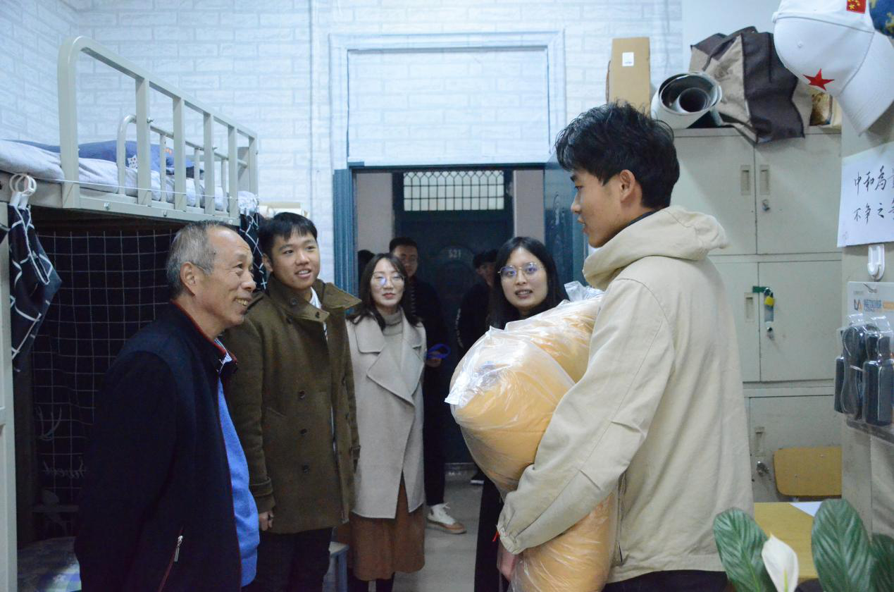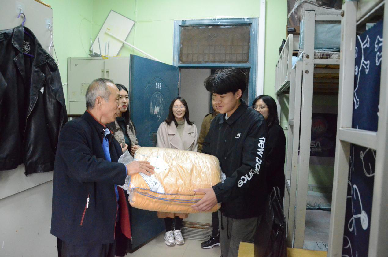 在送温暖活动中,老师们来到5号楼学生宿舍,为学生送上过冬棉被,让学生在这个冬季感受到来自学院的殷殷关切。各老师首先向学生宣讲党的十九届四中全会精神和省委书记王国生到我校与师生座谈时讲话精神,并衷心希望同学们能够真正领会十九届四中全会和王国生书记来我校讲话精神内涵,做社会主义合格建设者和可靠接班人。每到一间宿舍,我院领导老师与学生亲切交流,了解学生的学习和生活状况,勉励大家珍惜当下,不负青春,开拓进取,成长成才。对于来自省外的学生,学院领导更是关怀备至,嘱咐辅导员老师多关注他们的生活学习,提供必要的帮助。同学们纷纷表示会将温暖化为激励,将感动化作行动,刻苦学习专业知识,提升综合素质,用实际行动回报学院培养之恩。