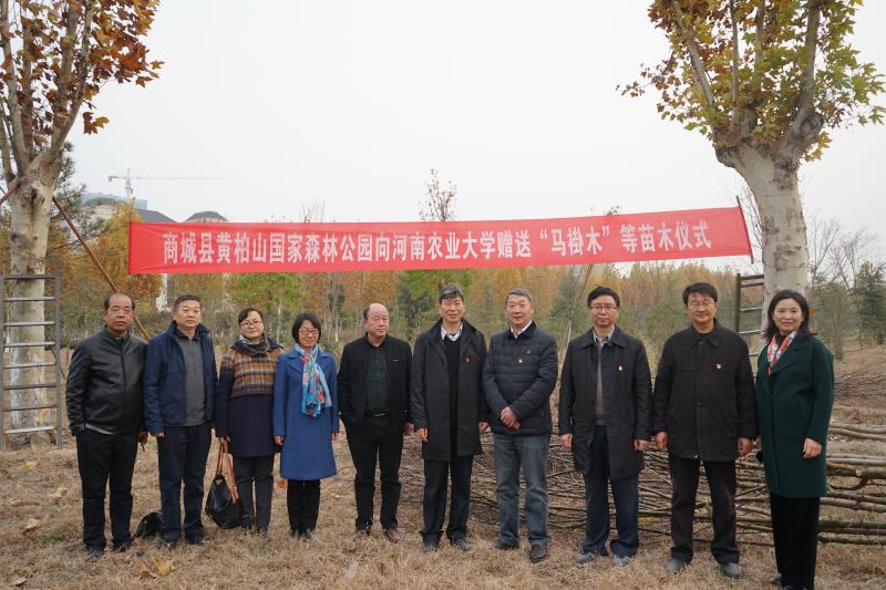 11月29日下午,商城县黄柏山国家森林公园管理处向我校捐赠“马褂木”等珍贵树种苗木仪式在我校龙子湖校区隆重举行。商城县黄柏山国家森林公园管理处主任、黄柏山林场场长纪道宝,商城县黄柏山国家森林公园管理处副书记丁大军,黄柏山林场生产科科长朱安宽,副校长杨喜田,校友办主任王云兰,龙子湖校区建设指挥部党总支书记张春玉,龙子湖校区绿化办主任孙玉隆,林学院党委书记郑东方、副书记张华以及龙子湖校区的师生共100多人出席了捐赠仪式。活动仪式由郑东方主持。