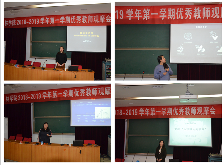 这次观摩活动由我院近年在学校讲课大赛获得佳绩的林学系郭芳、园林系石力匀、环境系顾海萍和艺术系李琪曼等四位老师授课示范。顾海萍从大家熟悉的童话《爱丽丝梦游仙境》片段阐述了“红皇后”假说起源,切入到生物进化,物种竞争。课程设计新颖,论述精辟,带入感强,课堂氛围融洽。郭芳讲授了《测树学》中的“树木生长量测定”,凭借着深厚的教学功底,深入浅出地将树木生长量测定的概念、分类和计算进行讲解,节奏迟缓有度,声情并茂,将晦涩难懂的学术概念讲授得通俗易懂。石力匀讲授了《观赏植物学》中的“植物的感官”,精美的课件制作,生动的讲课方式,调动听众的学习兴趣和积极性,课堂气氛活跃。李琪曼讲授了《中国原始社会美术》中的 “山顶洞人的项链”,从提问式开始,教学思路清晰,结构严谨,环环相扣,整个课堂如涓涓流水。