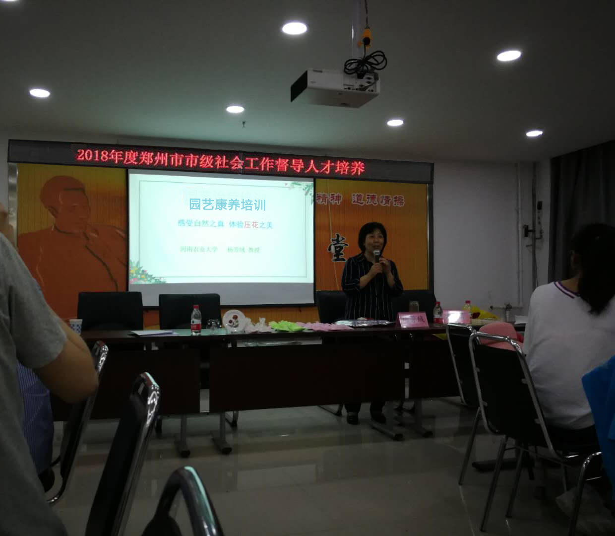 在服务中心,杨芳绒教授开展了“体验压花之美,感受自然之真”的专题讲座,社工人员及部分社会困难人士、疾病患者认真聆听讲座内容。她从压花概念、操作步骤、技术要点、作品欣赏等方面,详细讲解了压花艺术的基本知识和在园艺疗养中的作用,并且通过课堂示范,帮助大家体验和感悟绿色疗养带来的快乐。同时,杨教授强调了社工人员与社会困难人士、疾病患者之间交流互动的重要性,介绍了几种“以花为介,解压康复”的有效方法。期间,在杨教授的指导下,学生党员和大家共同参与压花创作、引导观花体验等,帮助社会困难人士、疾病患者在实践中减压康复。最后,师生还为郑州市福利院康复花园的修建提出了改造意见。