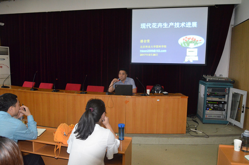 5月26日下午,我院邀请了北京林业大学园林学院潘会堂教授在2号楼学术报告厅为我院师生做了“现代花卉生产技术进展”的学术报告。副院长孔德政及园林系师生聆听了报告。