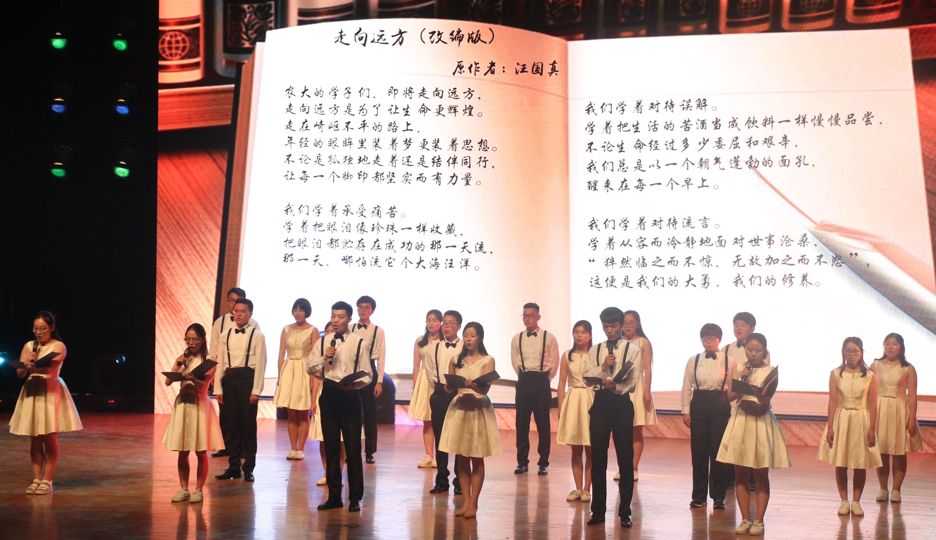以青春之名,赴梦想之会。6月13日下午,我院在文化路校区千人大礼堂举行了“青春不散场,梦想再起航”欢送2017届毕业生晚会。院党委书记郑东方、院长杨喜田等领导老师与我院全体2017届毕业生参观了此次晚会。 晚会伊始,一段充满创意的开场视频刻画出毕业生四年的生活印记,勾起了全场师生的点滴回忆。歌舞《舞所蔚惧》舞步轻快欢腾,展现了林学院学生和谐相处、筑梦未来的风采,点燃了现场观众的激情;音诗画《你好,再见》以音乐作灵魂,以诗歌作语言,将脉脉离别情表现的淋漓尽致;歌曲演唱《文化路校区的日子》带领现场毕业生怀念了校园里单纯的生活、相处的点滴;由我院毕业生学生干部带来的舞蹈《老干部的群魔乱舞》热情奔放,活力十足,激发了现场观众的热情,将晚会气氛推向最高潮,掌声持久不断,最后晚会在歌伴舞《忆·农大》及班主任代表王献老师的深情寄语中华丽谢幕。本次晚会节目均由毕业班班级自导自演,以青春与梦想为主线,为在场观众带来了一场视觉盛宴。 演出结束后,院党委书记郑东方、院长杨喜田等领导老师登台与全体演员合影留念,并为全体毕业生送上了诚挚的祝福。 “青春不散场,梦想再起航”毕业生晚会是我院毕业生文明离校主题教育活动之一,同时也是我院深入落实“大志、大爱、大雅”教育的重要体现,在表达毕业生与母校依依不舍离别情的同时,也推动了我院毕业生文明离校工作的有序开展。