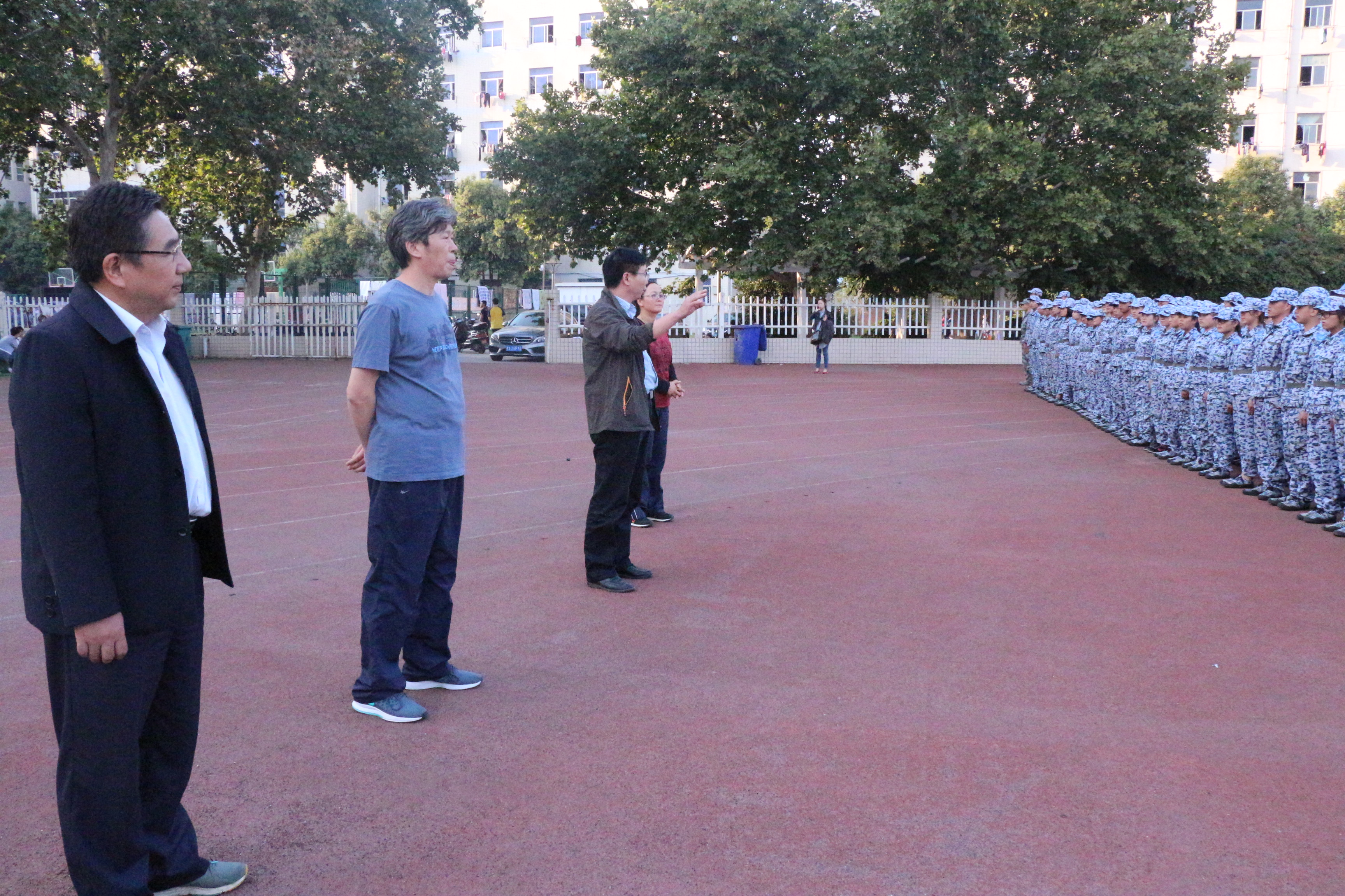 参训新生队列整齐,精神饱满,领导老师询问了新生军训情况,与教官深入交流,充分肯定了新生刻苦训练的精神,并对教官的辛勤付出表示感谢。郑东方鼓励同学们加强锻炼,磨练意志,认真完成军训任务,为即将开始的大学生活打下良好的基础。杨喜田希望同学们发扬艰苦奋斗的作风,保持昂扬斗志,用为期五天的军训为四年大学生活奏响美妙的序曲。随后郑东方、杨喜田等人深入各个班级与同学们进行交流,我院新生表示在训练中感受到学院对他们的关怀和重视,将会以更加饱满的热情迎接自己的大学生活。