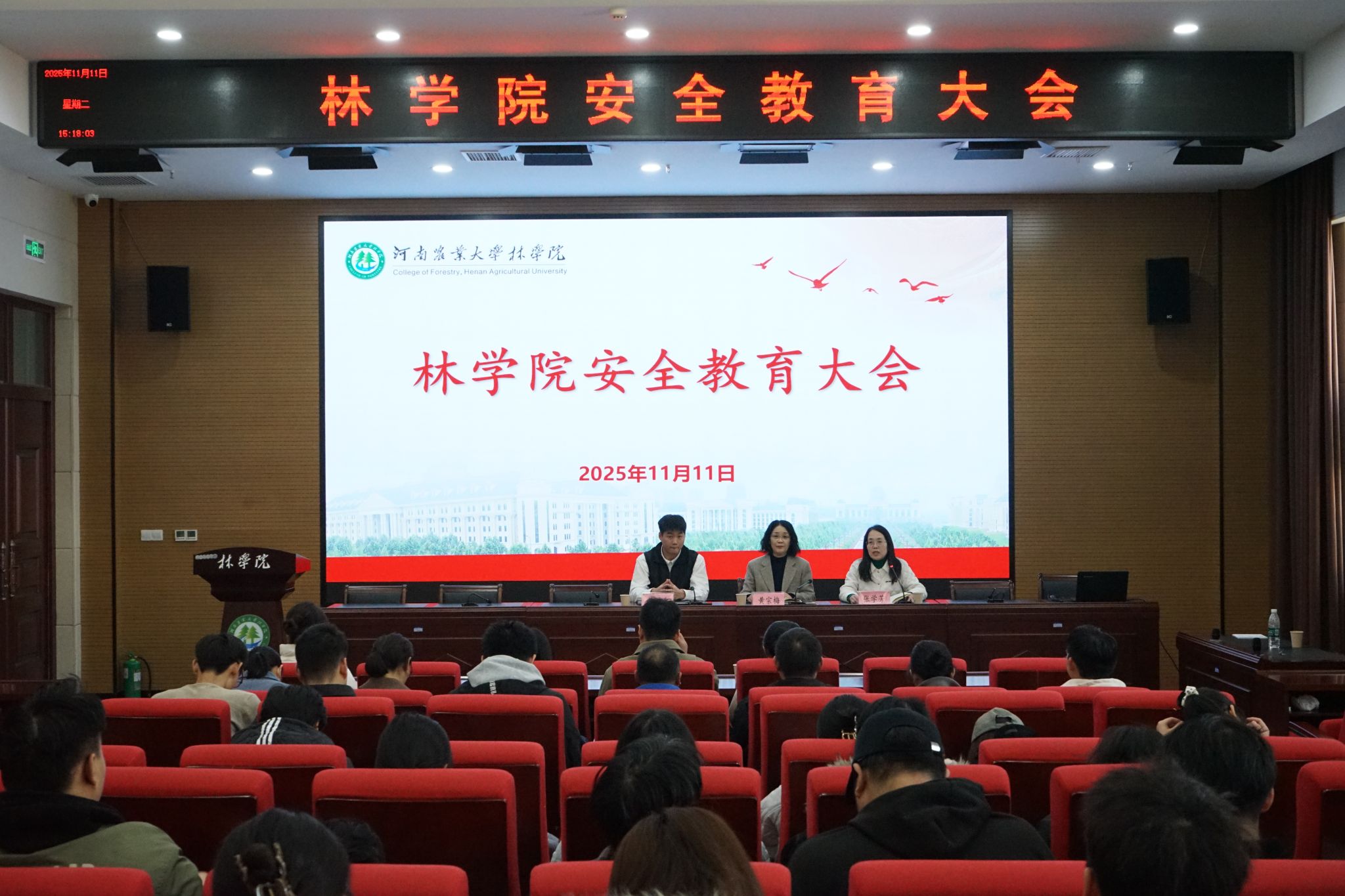 本网讯(通讯员 吴会芳)为增强师生消防安全意识、提升应急避险能力,11月11日下午,我院于力行楼428报告厅召开学院安全教育大会并开展消防安全演练活动。校实验室与设备管理办公室副主任黄宗梅、河南省消防协会教员吴昊森、副院长张学芳出席会议,学院师生代表参加本次会议,会议由张学芳主持。