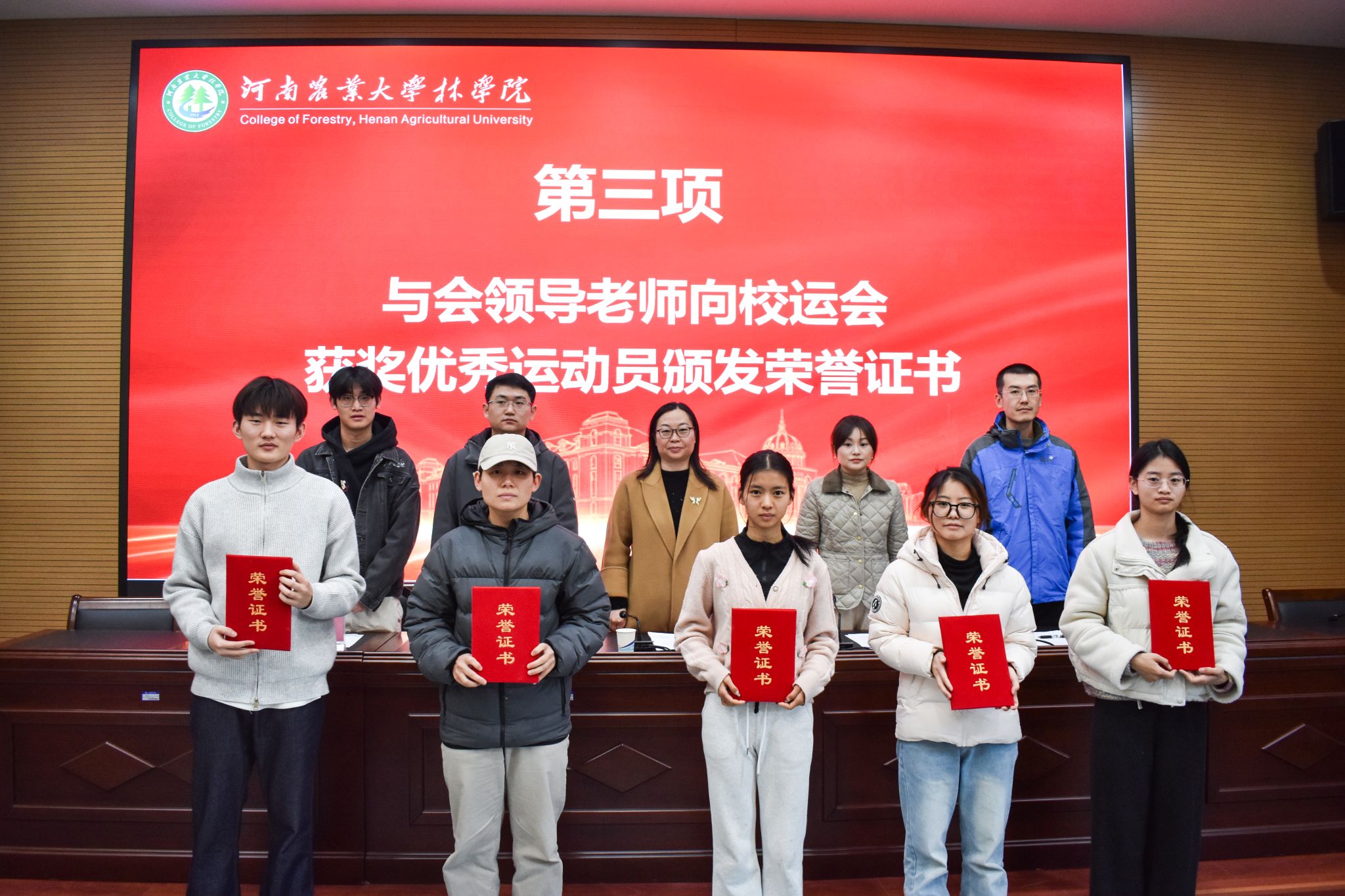 随后,与会领导老师向田径队教练员颁发聘书,为上一届校运会优秀运动员授予荣誉证书,以肯定付出、鼓舞士气。