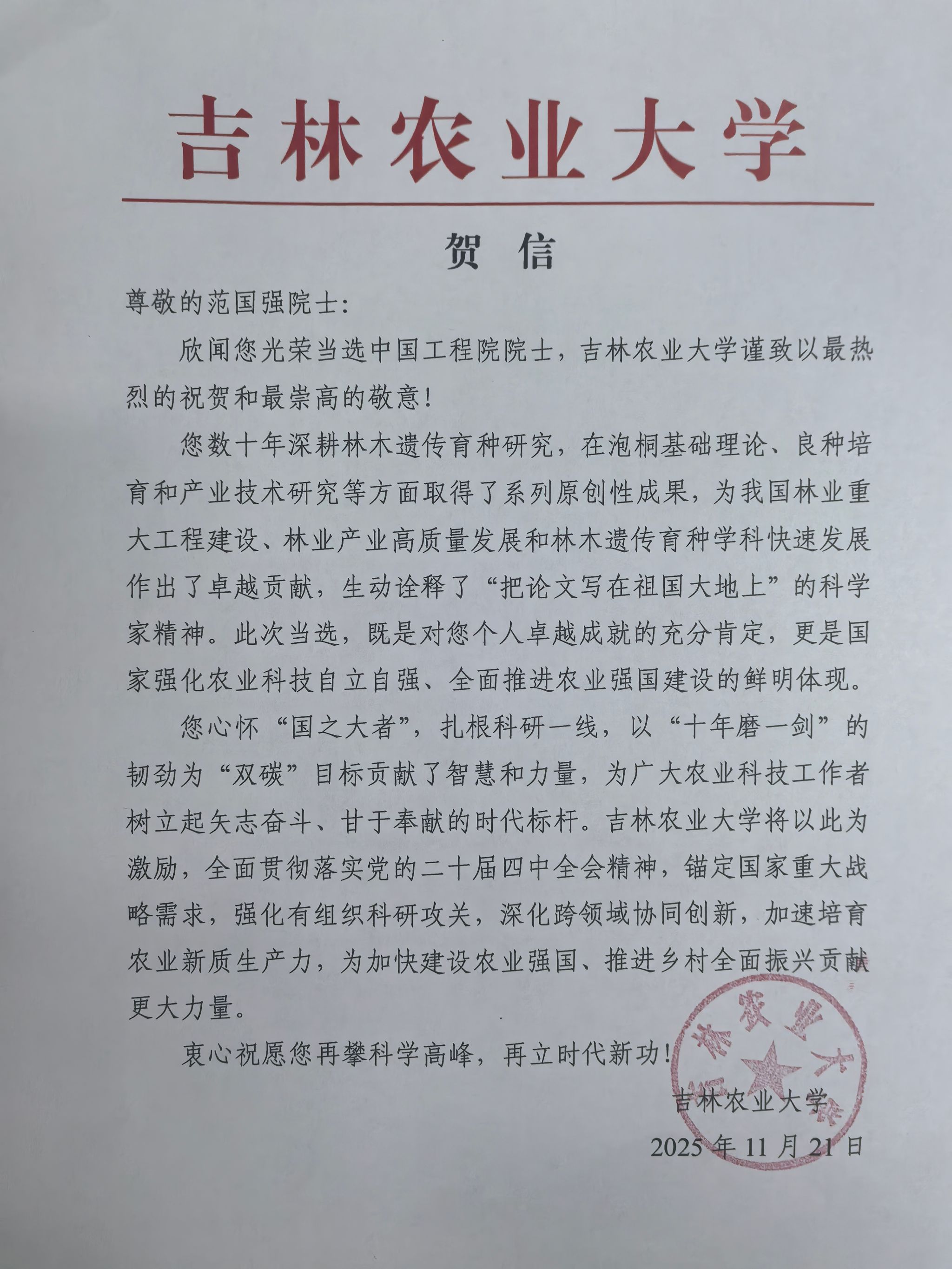 中国林学会赵树丛理事长致范国强院士贺信