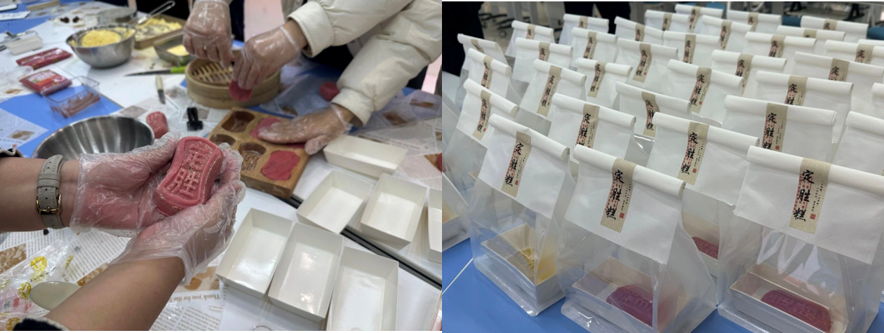 活动伊始,手工制作经验丰富的老师为大家详细讲解了定胜糕的制作步骤。从细腻的糯米粉筛选,到精心调配的馅料,再到独特的模具压花,每一个环节都讲解得细致入微。听完讲解,老师们兴致高昂,几人一组相互协作,有条不紊地完成一道道工序。经过筛粉、调馅、压模、蒸制后,一盘盘印有“定胜”字样的糕点新鲜出笼,香气四溢。随后大家分工进行包装、封袋,使每一份糕点都成为独一无二的“暖心礼包”。