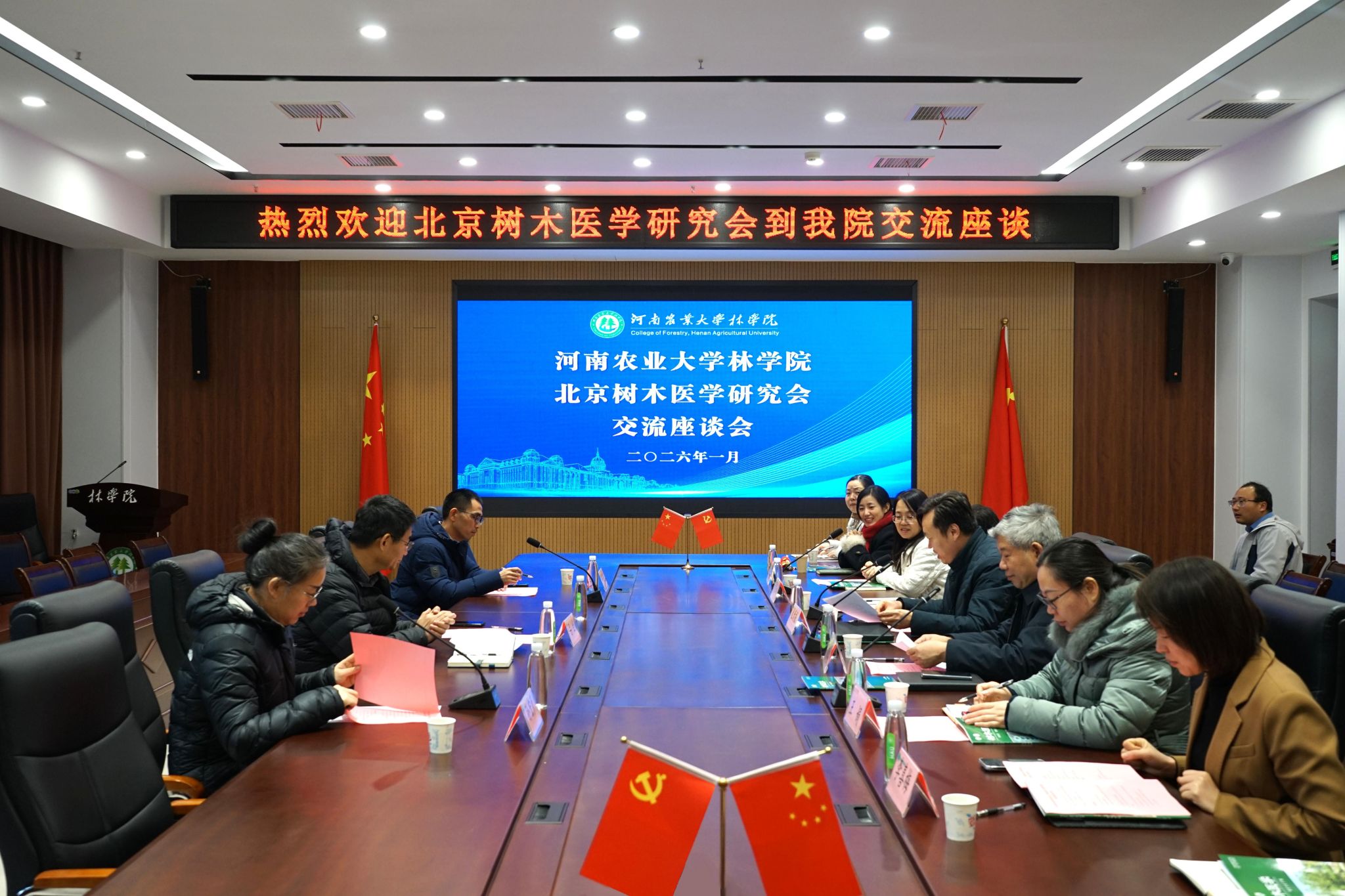 本网讯(通讯员 路晗 马源苑)1月17日,北京树木医学研究会秘书长吕全、《树木医学》编辑部主任孙宏彦、期刊编辑宋长青一行到访我院开展交流座谈,会议于力行楼-南-231举行。院党委书记化青报,中国工程院院士、院长范国强,河南省林学会副理事长尚忠海,院党委副书记王娟,副院长张学芳、李喜梅参加座谈会。会议由化青报主持。