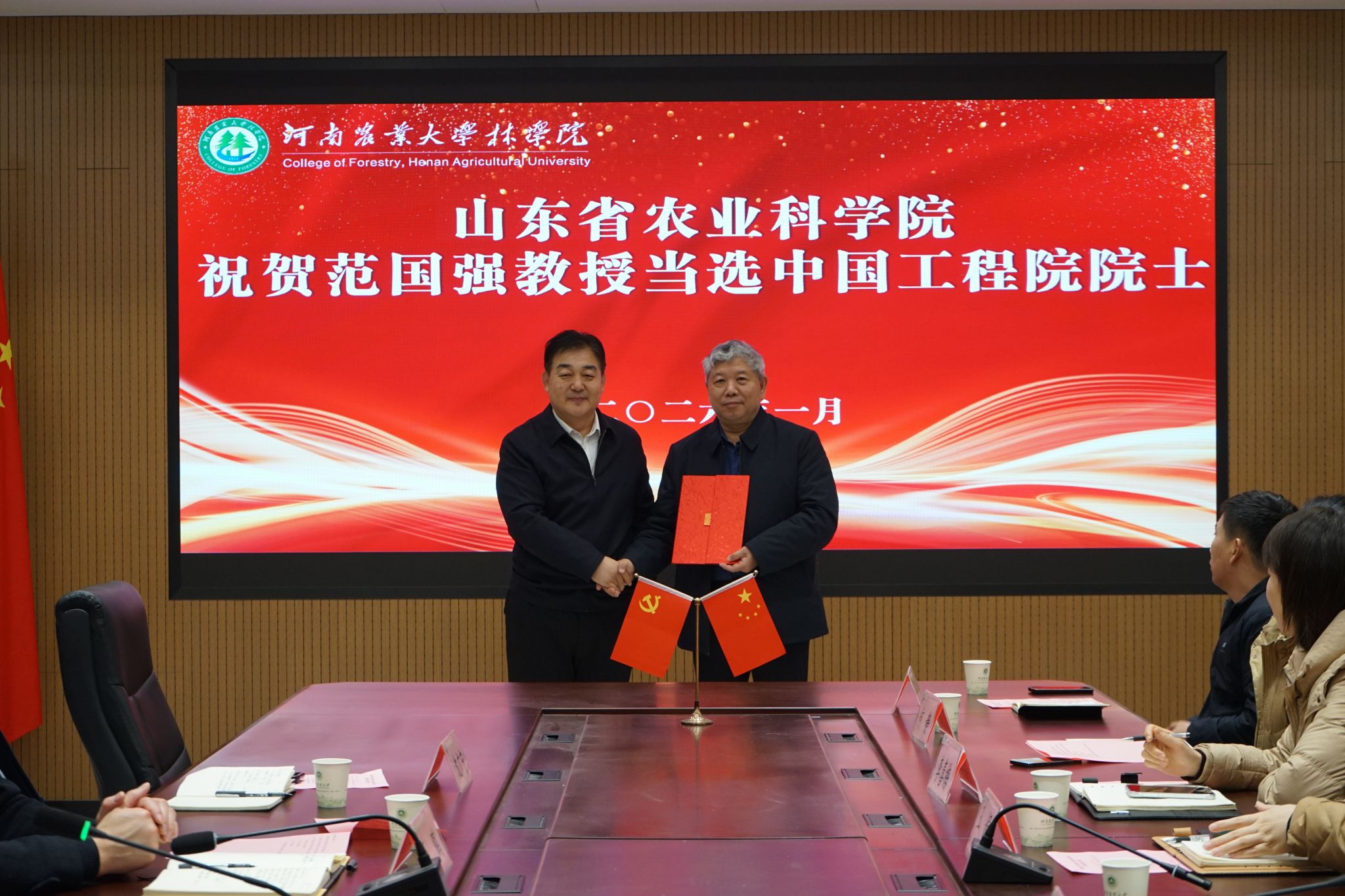 刘开昌介绍山东省农业科学院的基本情况与发展方向,感谢范院长在泡桐方面对农科院的关心和支持,希望双方充分发挥各自优势资源,持续拓展合作空间,推动交流合作走深走实。随后,刘开昌向范国强院士转赠山东省农业科学院党委书记梁金光同志委托亲笔贺信。