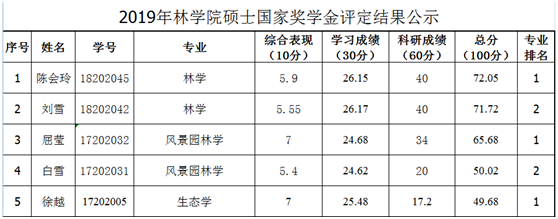 根据《河南省教育厅关于做好2019年高校学生国家奖助学金评审发放工作的通知》(教资助〔2019〕609号)和《河南农业大学研究生奖助学金管理办法》(校政研〔2018〕11号)文件精神,按照《河南农业大学2019林学院硕士研究生国家奖学金评定细则》的规定,本着 “公平、公正、公开”的原则,经本人申请、院研究生工作领导小组审核评议,院党政联席会研究决定,确定2019年硕士研究生国家奖学金获得者名单,现公示如下: