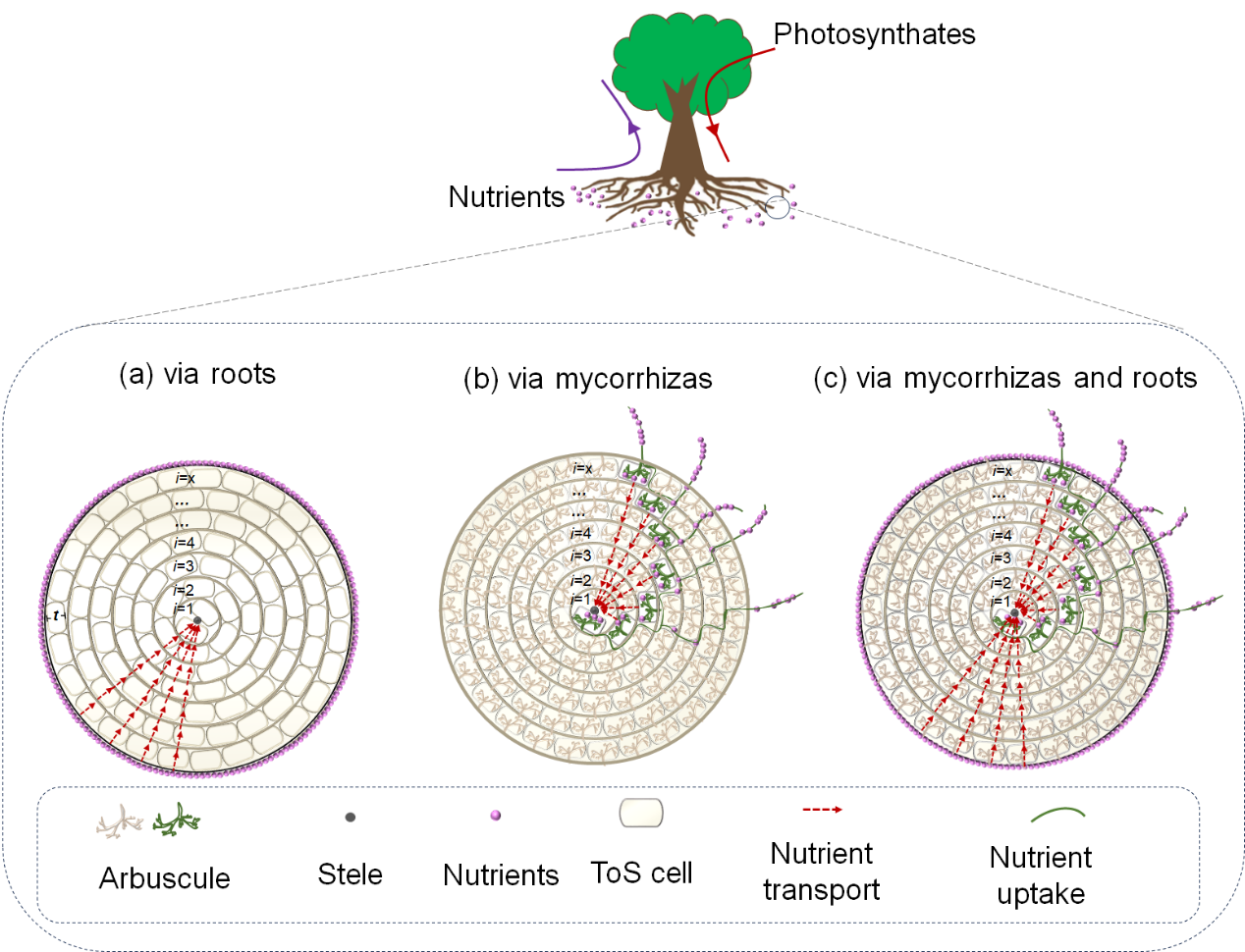 图3. 仅通过根进行养分吸收(a)、仅通过菌根真菌进行养分吸收(b),以及根与菌根真菌同时参与养分吸收(c)的模式图