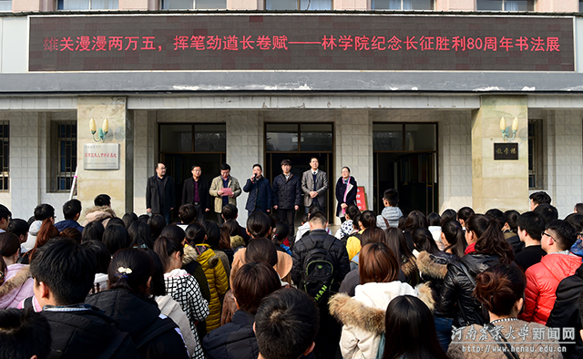 为纪念红军长征胜利80周年,积极响应习总书记倡导的“要把红色资源利用好,把红色传统发扬好,把红色基因传承好”的指示精神,12月2日上午,我院在文化路校区3号楼前举办以“雄关漫漫两万五,挥笔劲遒长卷赋”为主题的书法展活动。校党委副书记、工会主席褚金海出席活动开幕式,并和学校有关部门负责人、大学生们一起观看作品展。